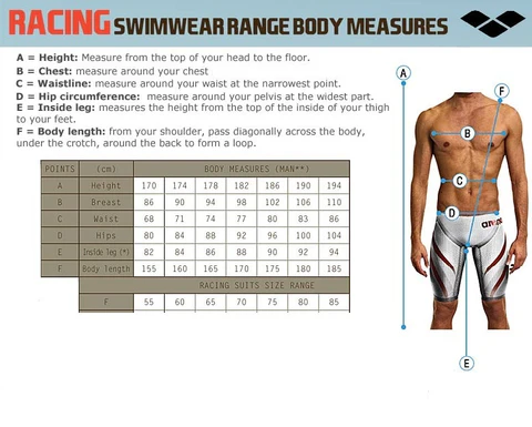 Erkek yüzücüler için en önemli ölçümler B (Bel) – C (Kalça) – D (Üst Bacak) ölçüleridir. Doğru bedeni bulmak için şu kurallara dikkat ediniz: