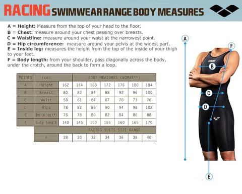 Kadın yüzücüler için en kritik ölçümler B (Göğüs) – C (Bel) – D (Kalça) ölçüleridir.
